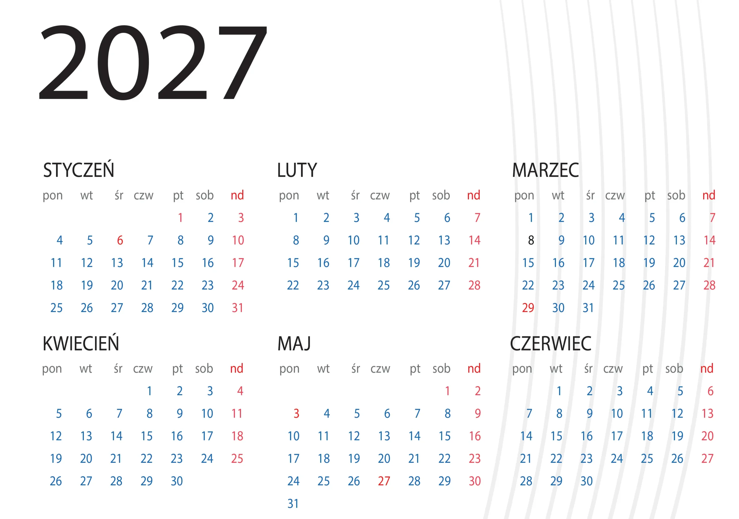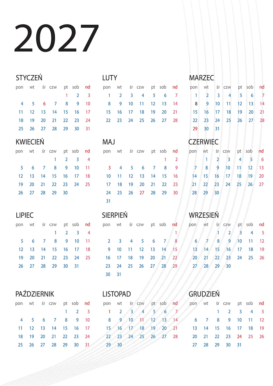 Projekt kalendarza 2027 — 12 stron A3, gotowy do edycji i druku