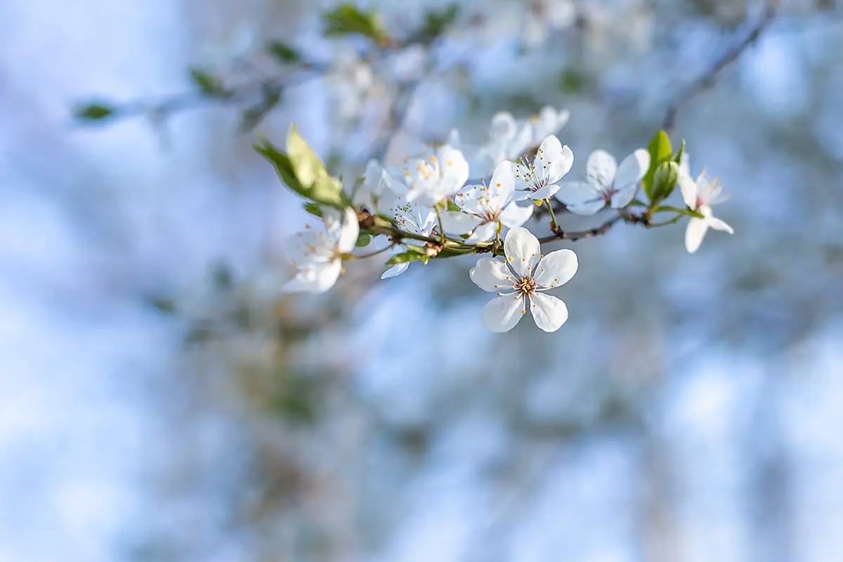 Delikatna wiosna – tło z białymi kwiatami i miękkim błękitem