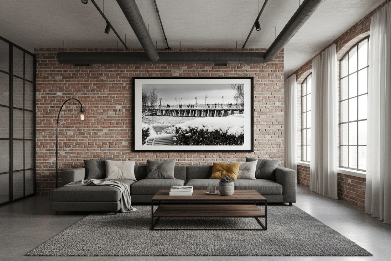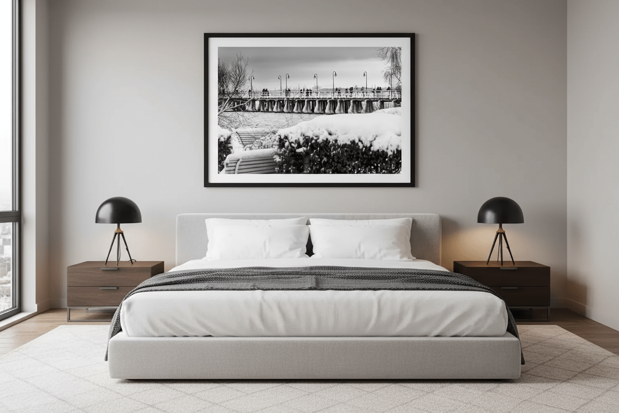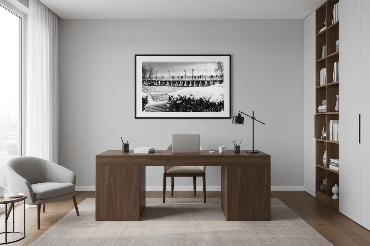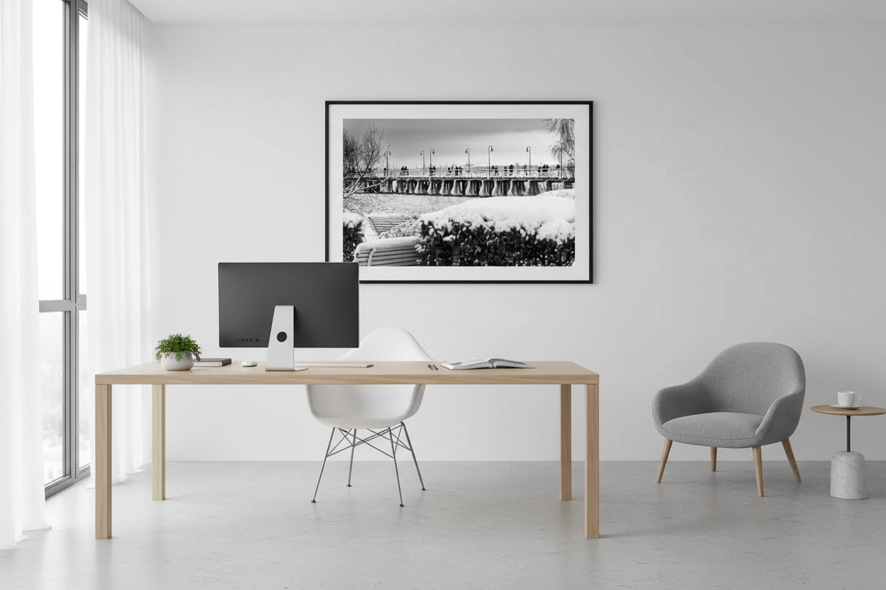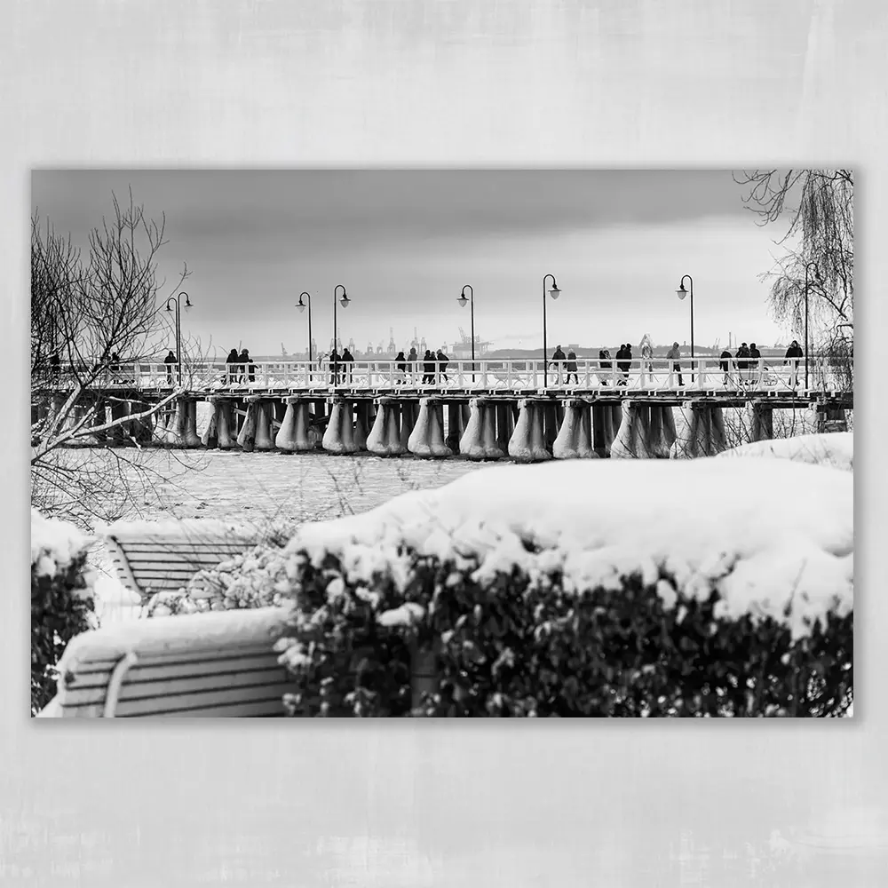 Szukasz czegoś prostego, ale z charakterem? Ten plakat czarno-biały pokazuje Molo w Gdyni w spokojnej, zimowej odsłonie. Czarno-biała fotografia pasuje do wnętrz w stylu minimalistycznym, skandynawskim, loftowym i nowoczesnym – szczególnie tam, gdzie chcesz dodać klimat bez krzyczących kolorów.