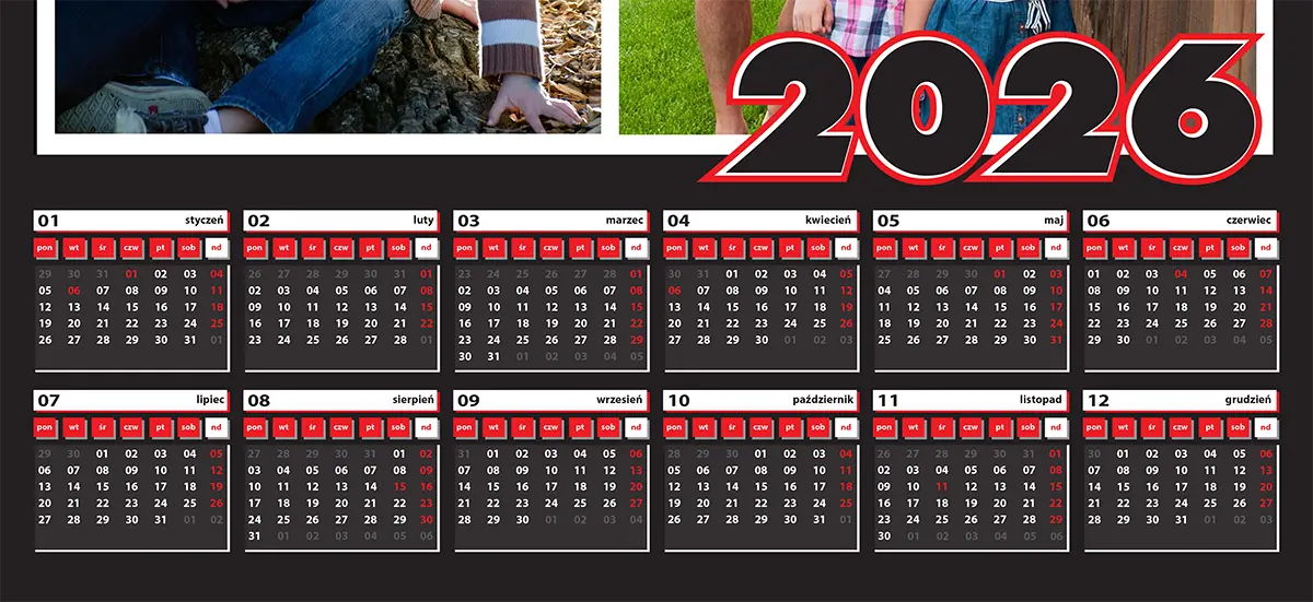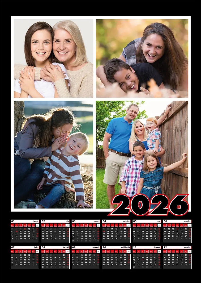 Szablon kalendarza 2026 – 1 strona A2, czarne kalendarium + miejsce na zdjęcie