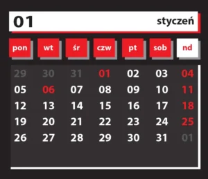- Czytelność: polskie nazwy miesięcy i dni tygodnia, klarowny układ numerów